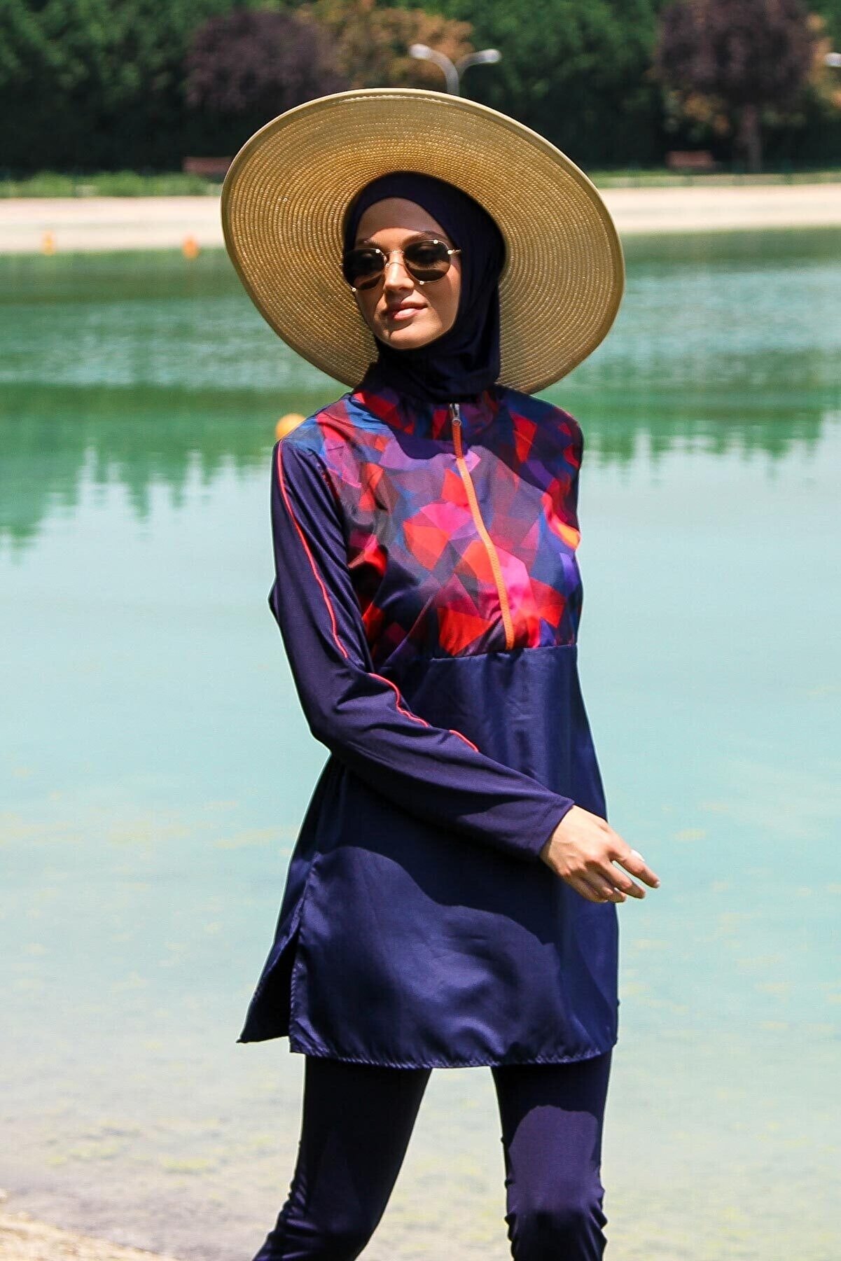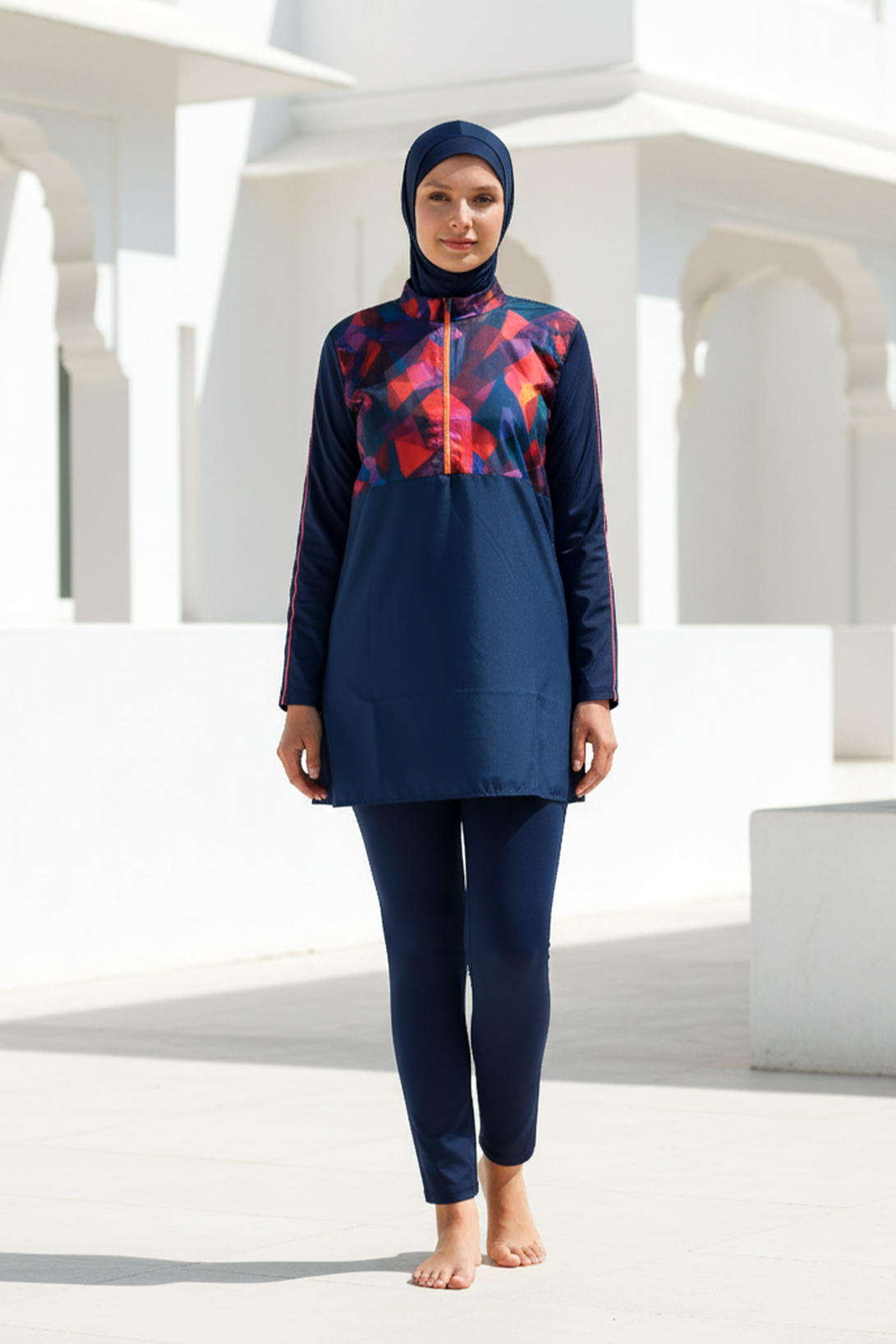 Paraşüt 3’lü Lacivert Desenli Tam Kapalı Tesettür Mayo – M2269