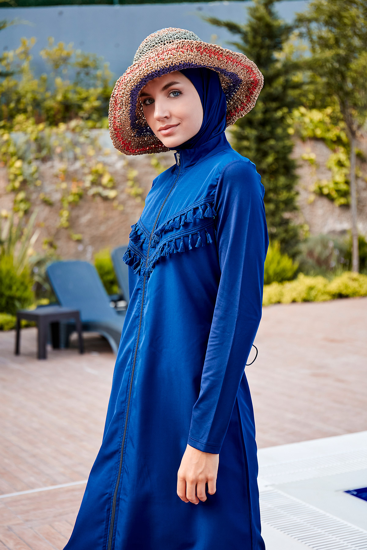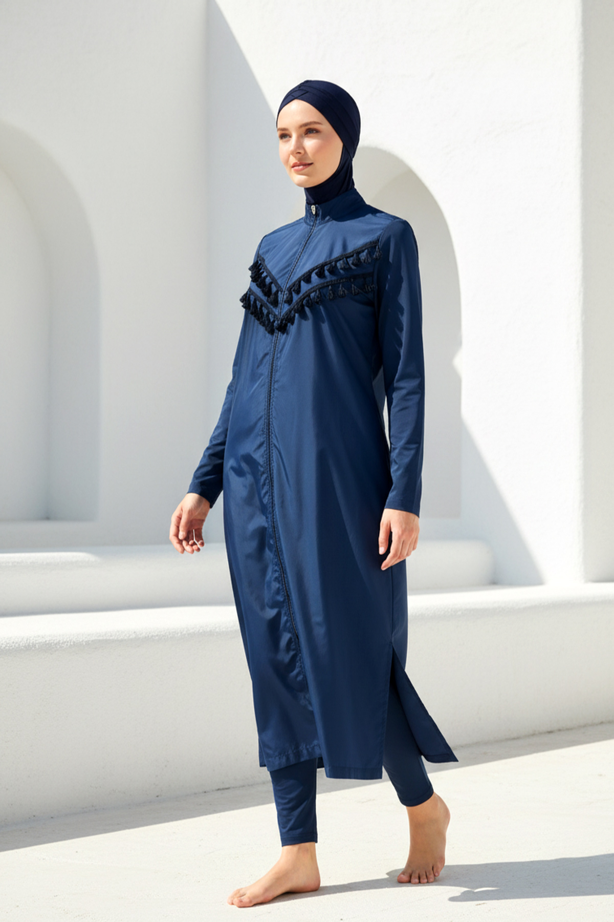 Tam Kapalı Tesettür Mayo Lacivert 1998 modeli, tunik, pantolon ve boneden oluşan 3 parçalı set yapısıyla plaj ve havuz kullanımı için fonksiyonel ve konforlu bir yüzme deneyimi sunar. Tam kalıp tasarımı sayesinde kendi bedeninizi güvenle tercih edebilirsiniz.